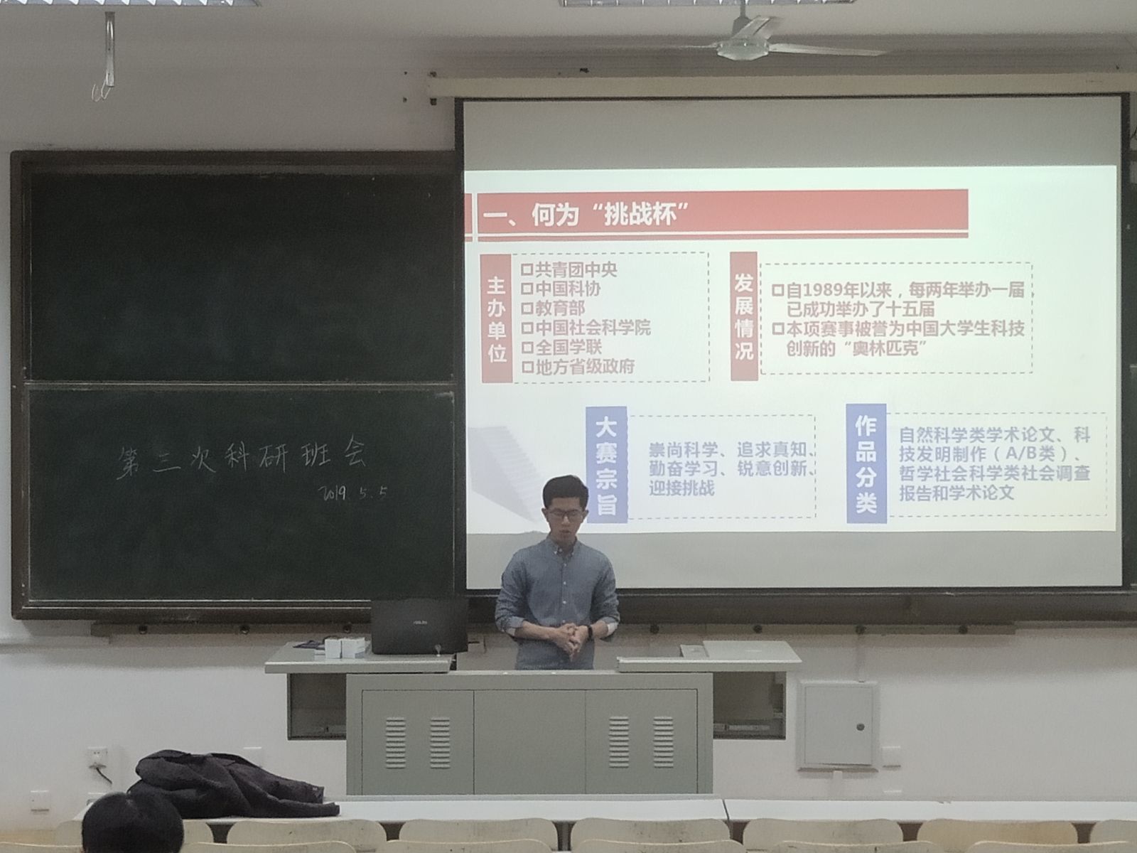 本站讯 5月5日晚,2018级信息与计算科学班于图东326召开本学期第三次科研班会。本次科研班会由科研班主任刘昱主持,班级全体同学参加。