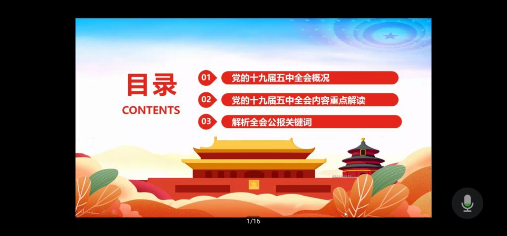 在此次11月主题团日会议中,团支书张弘扬通过党的十九届五中全会概况、党的十九届五中全会内容重点解读、解析全会公报关键词三个方面,为同学们进行党的十九届五中全会内容与内涵的解读与诠释。张弘扬的解析透彻、准确,讲解了包括我国发展环境面临的深刻复杂变化、到2035年要实现的9方面远景目标、“十四五”时期经济社会发展的6方面主要目标、实现奋斗目标的12方面具体举措等重点内容;解析了全会公报关键词,如实体经济、新发展格局、有效市场和有为政府、新型工农城乡关系、以人为核心的新型城镇化、国家文化软实力、人与自然和谐共生的现代化、更高水平开放型经济新体制、更高水平的平安中国等。最后,张弘扬强调了实现“十四五”规划和二〇三五年远景目标,必须坚持党的全面领导,充分调动一切积极因素,广泛团结一切可以团结的力量,形成推动发展的强大合力。要加强党中央集中统一领导,推进社会主义政治建设,健全规划制定和落实机制。要保持香港、澳门长期繁荣稳定,推进两岸关系和平发展和祖国统一。要高举和平、发展、合作、共赢旗帜,积极营造良好外部环境,推动构建新型国际关系和人类命运共同体。