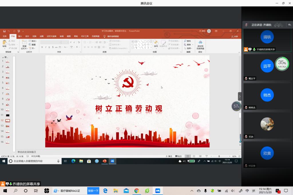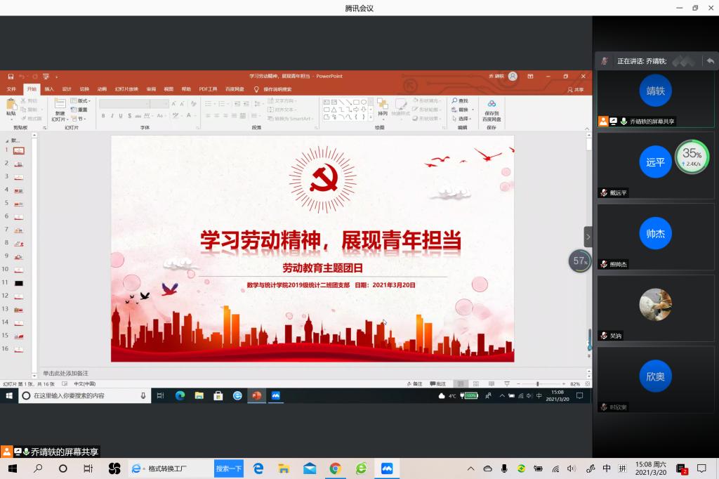本站讯 3月20日下午15:00,beat365中国唯一官网2019级统计学二班开展“学习劳动精神,展现青年担当”主题团日活动,本次主题团日活动以线上会议的形式进行。本次会议由团支书乔靖轶主持,2019级统计二班全体同学参加。