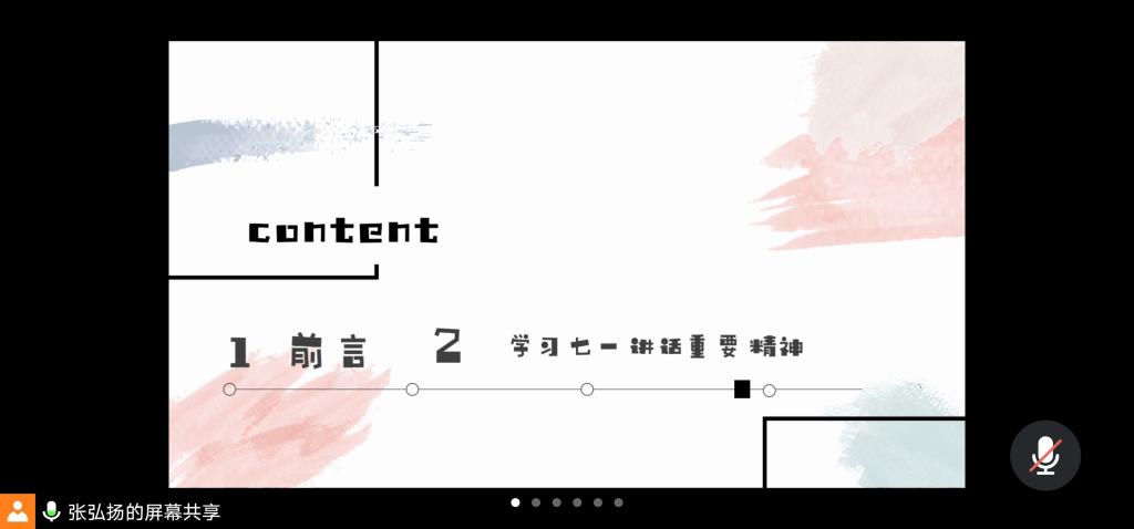 团支书张弘扬为大家剖析了两个“万岁”、三个“和”、三个“不变”、三个“绝不”、三个“不负”、三个“一切”、四个历史阶段、五个庄严宣告、九个“必须”等思想精华的具体内容,并且强调了能够代表党的核心精神的32个字:坚持真理、坚守理想、践行初心、担当使命、不怕牺牲、英勇斗争、对党忠诚、不负人民。随后,张弘扬为同学们播放了庆祝中国共产党成立100周年大会新闻联播视频,让同学们通过观看这举国欢庆之盛事,激发不忘历史、不忘初心的爱国精神。