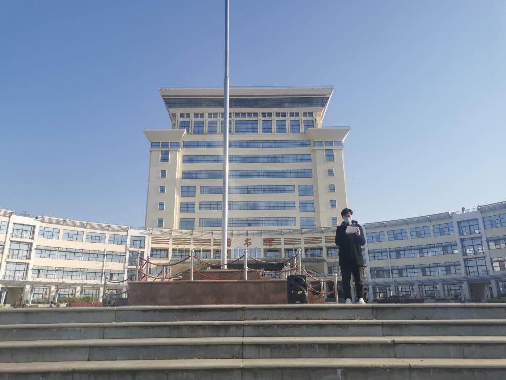 活动前夕,王肖晴在班级内开展升国旗主题团日的动员活动,介绍此次活动的开展背景及目的,带领青年团员积极参与,树立强烈的民族自豪感和历史责任感。主题团日活动于4月19日7:00准时开始,国旗手穿着整齐,步伐统一,脚踏鼓点,护卫国旗,严肃而庄重,同学们排列整齐,秩序井然。随后,进行升国旗唱国歌环节,同学们脱帽行注目礼,注视着鲜红的国旗徐徐升起,《义勇军进行曲》在同学们的歌声中更加坚定有力,当国歌声落下时,国旗恰好升至旗杆顶部,在清晨的微风中飘扬。之后,周冠华同学进行了国旗下演讲,提醒同学们居安思危,奋发图强,引领青年团员在实践生活中,立志为实现中华民族的伟大复兴贡献青春力量,周冠华声音慷慨激昂,燃起同学们心中的爱国魂。