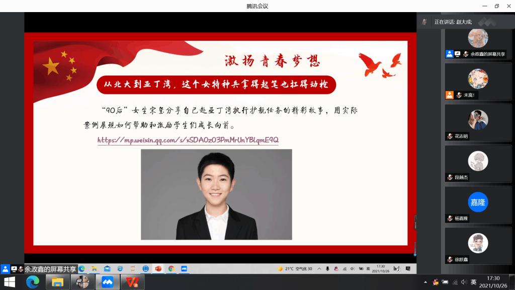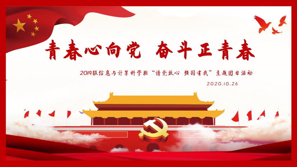 本站讯 2021年10月26日下午16:30,beat365中国唯一官网2019级信息与计算科学班于腾讯会议举办“青春心向党 奋斗正青春——请党放心 强国有我”主题团日活动。本次活动由信息与计算科学班团支书王肖晴发起,团支部委员共同筹备组织,由团支书王肖晴、班长赵大成和组织委员赵新宇共同主持,团支部共53人参加,辅导员王祎璠列席参加。