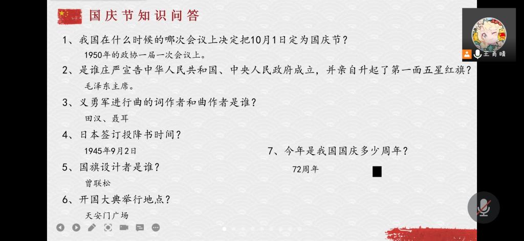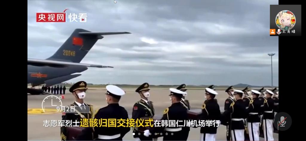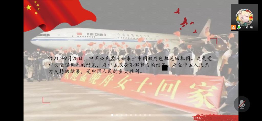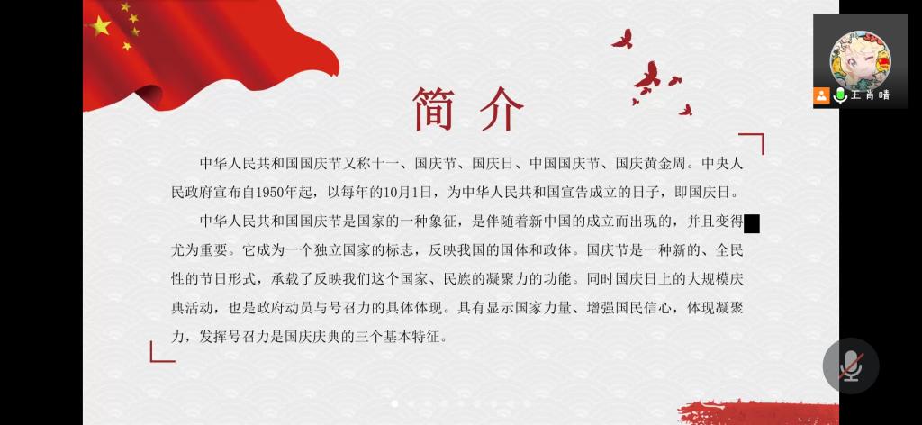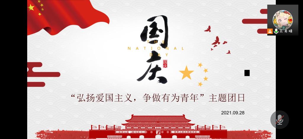 团支书王肖晴首先向大家简单介绍了十一国庆节的来历、作用及基本特征,并分成了国庆节知识问答、志愿军烈士遗骸回国、孟晚舟回国、观影《我和我的祖国》四个篇章向大家弘扬爱国主义精神。在知识问答环节中,大家踊跃回答国庆节的相关知识,充分活跃了会议气氛。祖国的强大是无数的英雄用鲜血和生命换来的。就在今年9月3日,第八批在韩志愿军烈士遗骸安葬仪式在沈阳举行,团支书带领大家用100秒回顾了第八批志愿军烈士的回家路,同学们在观看视频后,纷纷留言向烈士致敬。2021年9月25日,中国公民孟晚舟在经过三年的无理拘押后乘坐中国政府包机返回祖国。经过团支书王肖晴的简单介绍后,同学们的爱国之情被激起,并纷纷表示自己切实感受到了国家的强大以及国际地位的提升。活动最后,大家一起观看了影片《我和我的祖国》,一起回顾了祖国的成长历程。