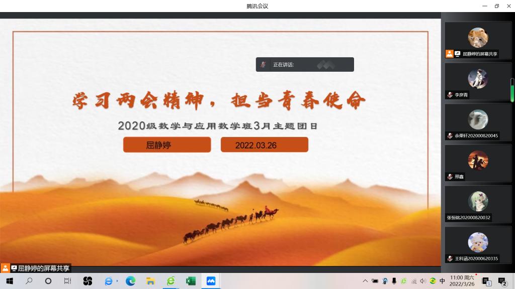 3月24日下午,2020级数学班全体同学在宿舍进行“一小时劳动圈”大扫除活动,宿舍中的同学们相互配合,将地板书桌清扫干净,并进行防疫消杀工作,。通过此次活动,既改善了学习环境,同学们也锻炼了身体。3月26日,班长李彦青于腾讯会议召开“从我做起,科学防疫”的线上班会,从疫情防控知识、防疫生活贴士、疫情防控违规行为、致山大学子的倡议书四个方面带领同学们进行疫情防控专项学习,充分展现团员青年团结一心、奋力战“疫”的精神风貌。随后,2020级数学班开展“提高防范意识,严防网络诈骗”线上专题学习会,观看视频了解防诈骗知识,李彦青带领大家一同认真学习防电信诈骗有关知识,提高同学们防电信诈骗能力。同天上午,团支书屈静婷主持开展“学习两会精神,担当青春使命”特别主题团日。屈静婷先播放两个视频带领同学们了解两会基本知识与2022政府工作报告,随后对2022两会精神进行解读,增强团员青年担当新使命、建功新时代的责任感和使命感。