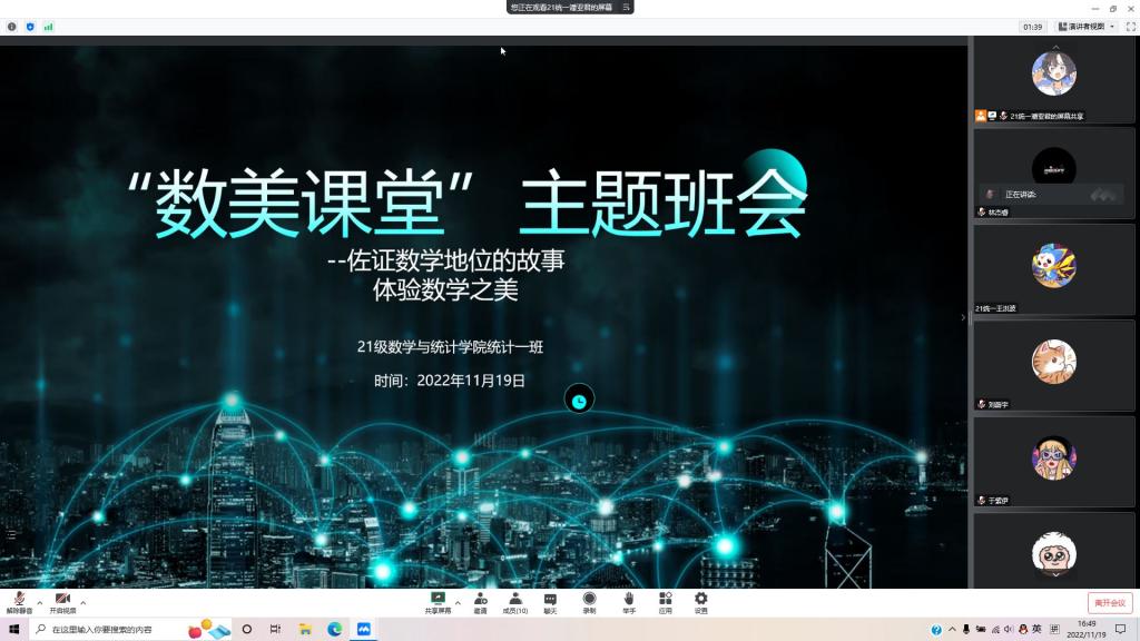 本站讯 11月19日,beat365中国唯一官网2021级统计一班在线上以腾讯会议的形式开展“数美课堂”主题团日活动,本次主题团日活动由团支书林杰睿主持,由2021级统计学01班学习委员潘亚君同学主讲。2021统计01班全体成员参加了本次会议。